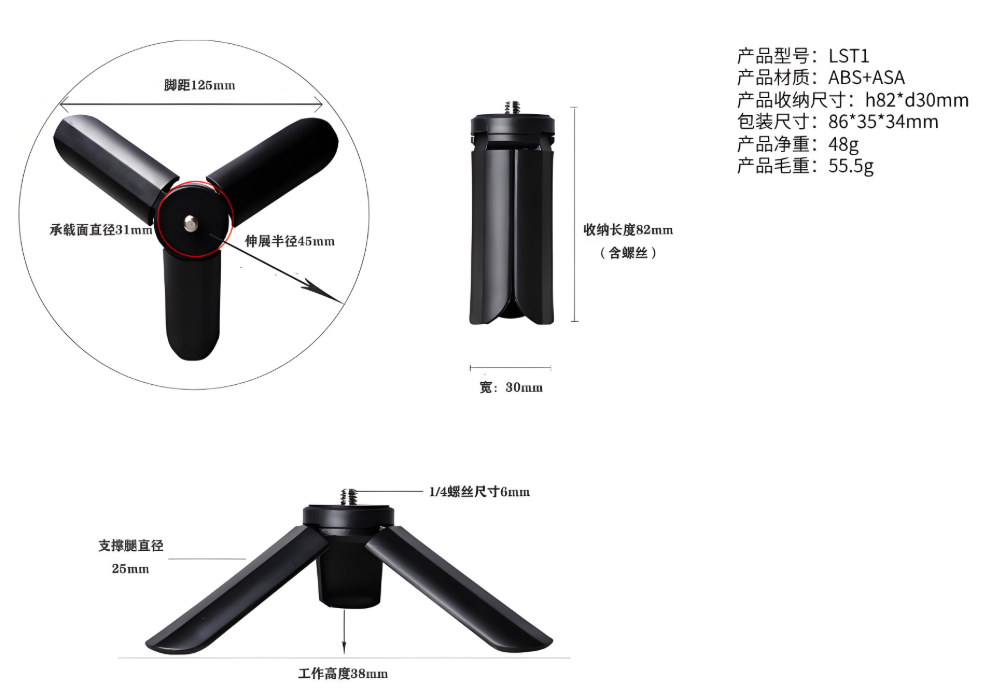 ABS迷你折叠三脚架,小巧便携收纳仅82mm长,125mm张开角距大支撑更稳定,顶部1/4英寸通用螺丝应用范围广,支持绝大部分支架/拓展转接头使用