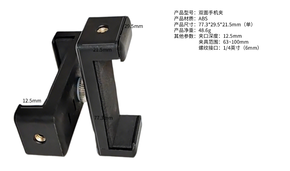 原用于支架提词器的双面夹具,一面夹取提词手机,另一面夹取直播手机使用,现作为套餐配件布局,可用于任意具备1/4英寸的支架使用