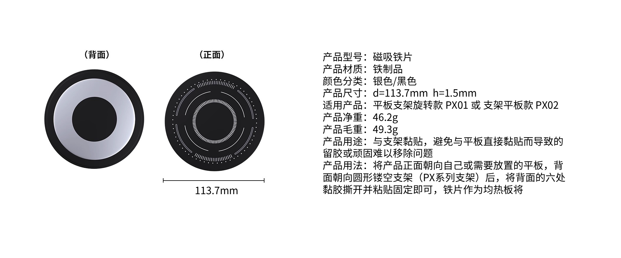 ABS支架+碳素钢片底座手机用支架,面板、支撑处、底座均可自行黏贴防滑垫,强力吸附紧密贴合手机,不惧滑落